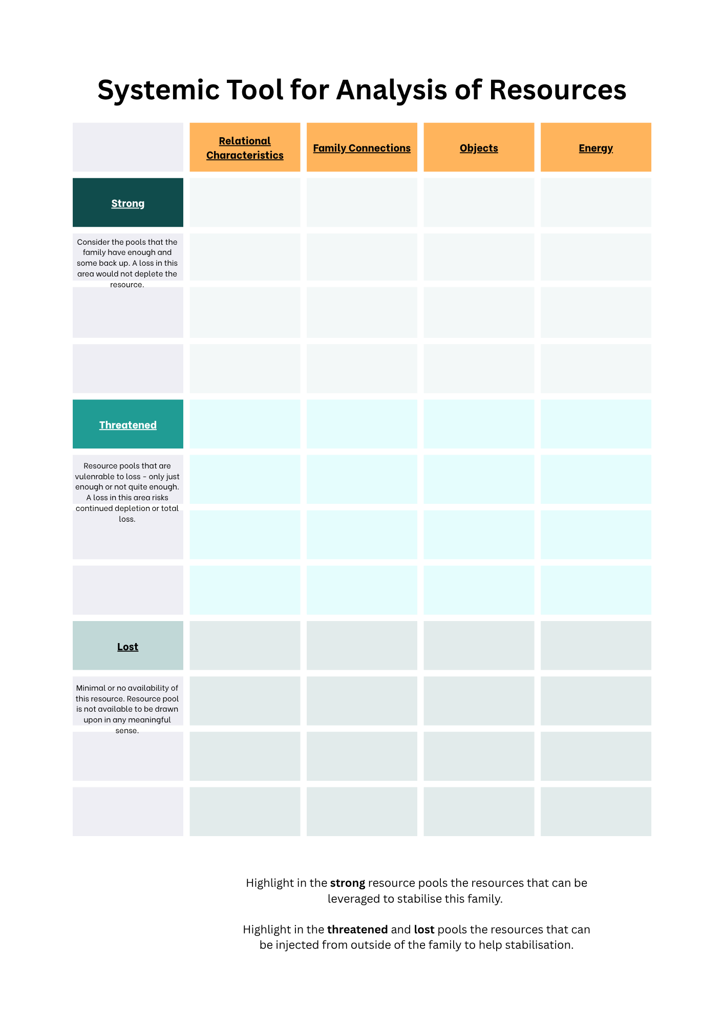 By using this tool systematically, practitioners can develop more nuanced, effective approaches to family work that honour both the complexity of family systems and the practical realities that families face in their daily lives.