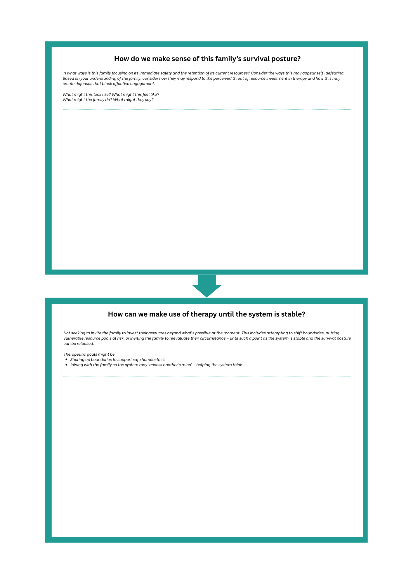 The key insight is recognising that asking a family in survival posture to engage in traditional talk therapy is somewhat like asking someone who's drowning to participate in swimming lessons. The immediate need for safety and stability must be addressed before the person can focus on skill development and growth. Similarly, families in survival posture need their resource threats addressed before they can fully engage with therapeutic processes aimed at change and growth.