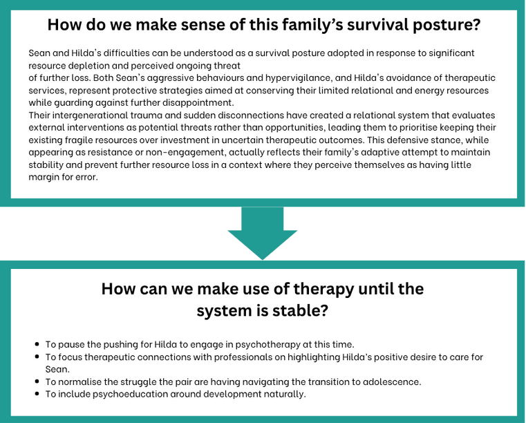 Sean is 13 years old and lives with his maternal grandmother, Hilda, after having been removed from parental care due to protective concerns. His care team requested a consultation to better understand problems in Sean’s behaviour and how to support Hilda. The care team reported Hilda presented as highly stressed and overwhelmed by Sean. A recent referral had been made to a clinical service that offered therapy to kinship carers, however Hilda had cancelled multiple appointments stating that she was unable to attend due to her work and ongoing fatigue. The care team around Sean and Hilda described feeling ‘stuck’ when considering what services would promote the stability of the current placement.